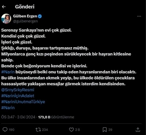 Türkiye'yi derinden sarsan 8 yaşındaki Narin Güran'ın cinayeti ile ilgili sosyal medya hesabından çokça paylaşım yapan Ergen, Seranay Sarıkaya'yı yaşanan olaya sessiz kaldığı için topa tuttu.