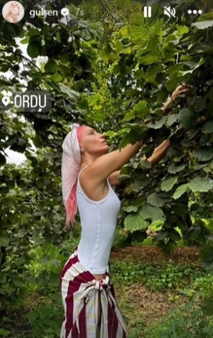 Memleketi Ordu'da bulunan fındık bahçesine giden ve burada ağaçtan fındık toplarken çekilmiş bir karesini takipçilerinin beğenisine sunan Gülşen beğeni topladı.
