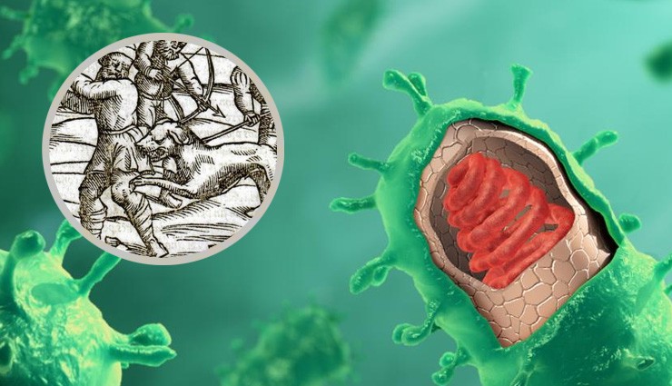 İnsanların enfekte bir köpeğe saldırmasını tasvir eden, Orta Çağ'dan kalma bir gravür (ABD Ulusal Tıp Kütüphanesi)