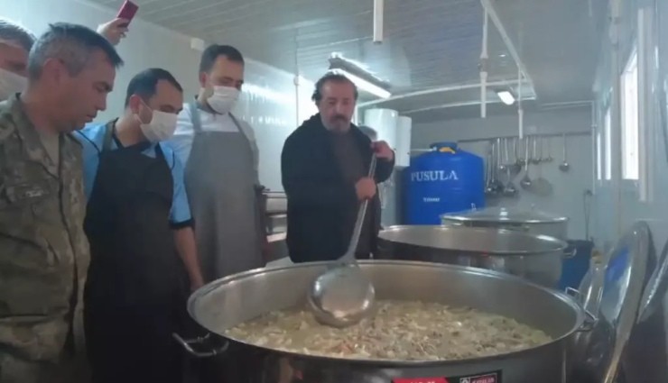 Yalçınkaya, Hatay’da da Milli Savunma Bakanlığı’nın kurduğu sahra mutfağını ziyaret ederek, depremzedeler için yemek pişirdi.